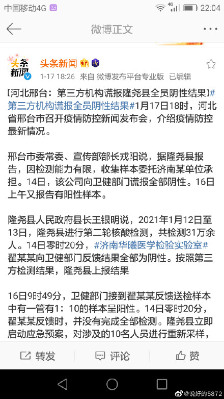 隆尧县人民政府县长王银明说,2021年1月12日至13日,隆尧县进行第二轮核酸检测,共检测31万余人。14日零时20分,#济南华曦医学检验实验室#翟某某向卫健部门反馈结果全部为阴性。按照第三方检测结果,隆尧县上报结果