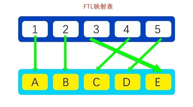 固态硬盘虽然读写速度比机械硬盘快很多,但闪存不能像磁盘盘片那样直接覆盖写入,这就意味着固态硬盘必须要有一个逻辑地址与实际物理地址之间的转换表;当对3号位置进行覆盖写入时,固态硬盘内实际执行的可能是对E位置的写入,然后让原本对应的C位置无效。
