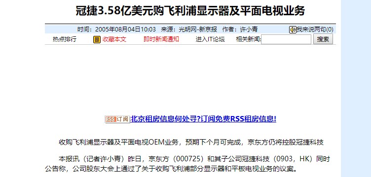 为了能够持续运营,精简业务是必须的。自 2000 年开始,飞利浦陆续对外销售其家电板块中的不同业务部门。首先遭到剥离的是消费电子业务,2005 年,飞利浦以 3.58 亿美元将显示器及平面电视 OEM 业务出售给京东方旗下的冠捷科技(即 AOC),冠捷因此成为全球最大的 PC 显示器制造商。