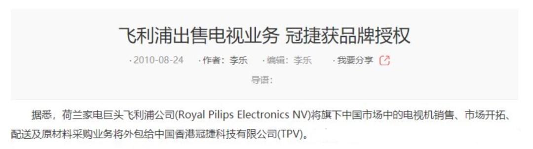 2010 年,飞利浦将旗下中国市场中的电视机销售、市场开拓、配送及原材料采购业务全部外包给冠捷科技。与此同时,飞利浦还和船井电机株式会社签署了北美和墨西哥的电视机品牌许可协议,和威迪奥控集团签署了印度的电视品牌许可协议。实际上,这意味着飞利浦在全球逐渐淡出电视市场。
