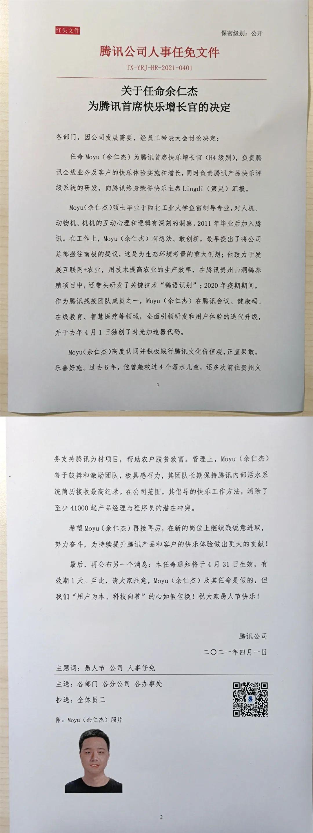 任命 Moyu(余仁杰)为腾讯首席快乐增长官(H4 级别),负责腾讯全线业务及客户的快乐体验实施和增长,同时负责腾讯产品快乐评级系统的研发,向腾讯终身荣誉快乐主席 Lingdi(第灵)汇报。