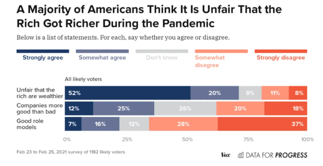 在接受调查的选民中,有 72% 的人都认为,亿万富翁在疫情期间变得更富有,这是极大的不公平。只有 19% 的人反对这样的看法。在所有种族、党派和社会经济群体中,这一结果都出奇地一致。