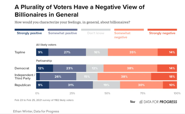 只有 23% 的受访者表示,他们认为亿万富翁是美国的典范,而 65% 的人持否定看法。同样,只有 36% 的受访者表示,他们对亿万富翁的总体感觉是正面的,而多达 49% 的受访者持负面态度。不过,黑人群体的情况略有不同。有 45% 的黑人受访者对亿万富翁持正面看法,高于持负面看法的 39%。与共和党人相比,民主党人也更加反感亿万富翁。