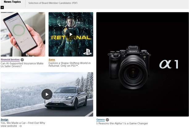 新网站的首页将每周更新一次,以吸引人的方式向来访者介绍索尼六项业务的最新资讯 (包括游戏和网络服务、音乐、影视、电子产品及解决方案、图像和传感解决方案、金融服务业务)。