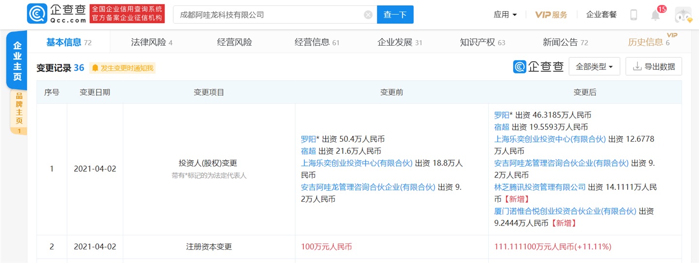 6日消息 企查查 App 显示,4 月 2 日,成都阿哇龙科技有限公司发生工商变更,新增股东林芝腾讯投资管理有限公司和厦门诺惟合悦创业投资合伙企业 (有限合伙),注册资本由 100 万元变更为 111.1111 万元,增幅为 11.11%。