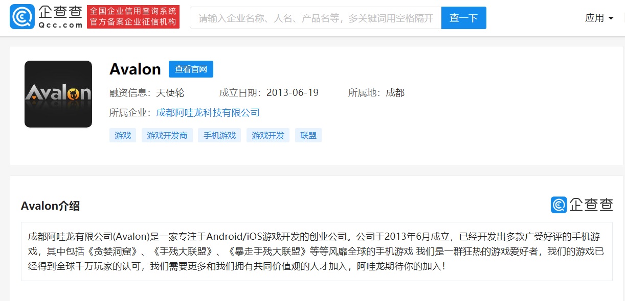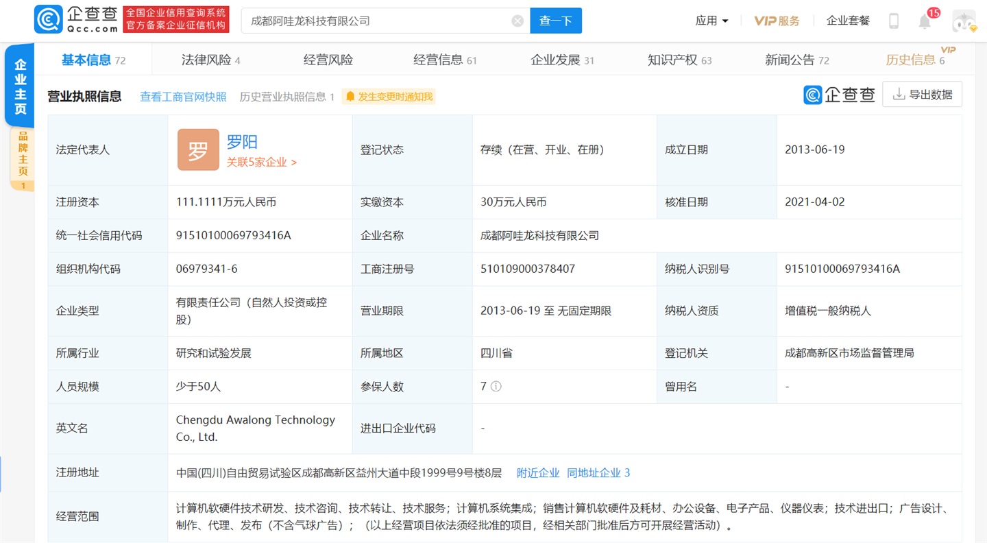 企查查显示,成都阿哇龙科技有限公司是一家专注于 Android/iOS 游戏开发的创业公司,成立于 2013 年 6 月,法定代表人为罗阳,经营范围包括:计算机软硬件技术研发、技术咨询、技术转让、技术服务等。