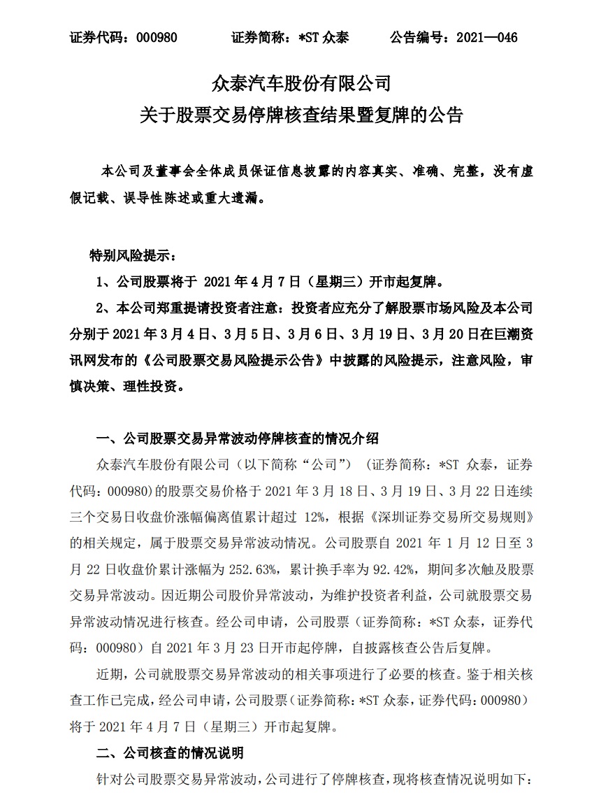 ,ST 众泰称,据有关传言,本公司此次预重整投资人是特斯拉、小米、蔚来或者宝能。经向公司预重整管理人浙江京衡律师事务所核实,特斯拉、小米、蔚来和宝能均不是《众泰汽车股份有限公司关于公开招募投资人进展的公告》中提到的有关协议的相对方。公司亦不存在与其进行过有关商谈或者签订合作协议的情形。经核查,公司未发现前期披露的信息存在需要更正、补充之处。