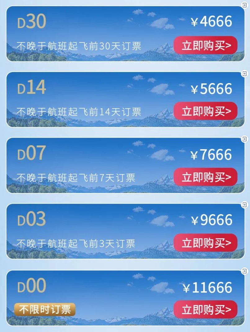 「前程万里」产品以 10000 公里为单位销售,根据预订座位的最晚时限 (不晚于航班起飞日期的天数)条件分为 30 天(售价 4666 元)、14 天(售价 5666 元)、7 天(售价 7666 元)、3 天(售价 9666 元)和通用 (不限时) (售价 11666 元)五种规格,售价不同。用户预订航班座位时,根据所订航班的航线距离和舱位,在所持产品中扣减相应里程。使用该产品换购机票较普通公布运价有较大的价格优势,未来机票价格变化不影响本产品使用,有利于使用人预算管控。