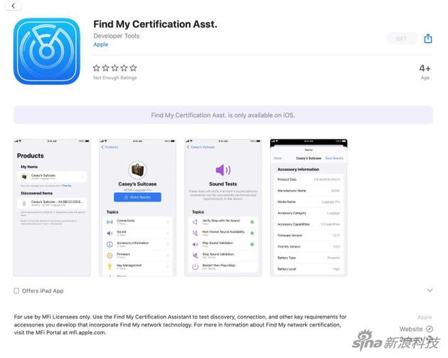 根据 Sensor Tower 的数据,“查找产品认证助手”这个 App 于 4 月 4 日(星期日)在 iOS App Store 上线。虽然下载渠道是公开的,但拥有 MFi 许可的人才可以用。用来测试其配件的“发现,连接和其他关键要求”,这些配件将支持苹果的查找系统技术。它还指向 mfi.apple.com 上 Apple MFi 门户上有关“查找”认证计划的信息。