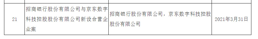 列表显示,招商银行股份有限公司与京东数字科技控股股份有限公司新设合营企业案获市场监管总局无条件批准,审结时间为 2021 年 3 月 31 日。