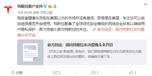 特斯拉官方今日对此回应称:驾驶室摄像头目前在北美以外的市场并没有激活。即使是在美国,车主也可以自由选择是否开启使用。特斯拉配备了全球领先安全等级的网络安全体系以确保用户隐私保护。