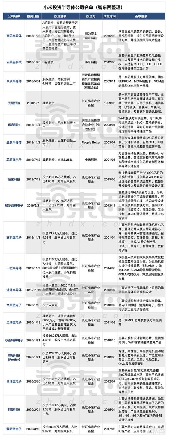 附:从 2018 年初到 2020 年 3 月小米投资半导体公司名单