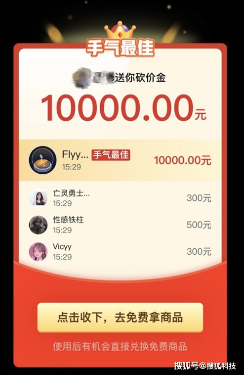而在参与砍价的好友中,有不少人收到了 “全场免单,15 分钟后过期”、“XXX 送你砍价金 10000 元”等弹窗,引导他们也参与 “砍价免费拿”活动。