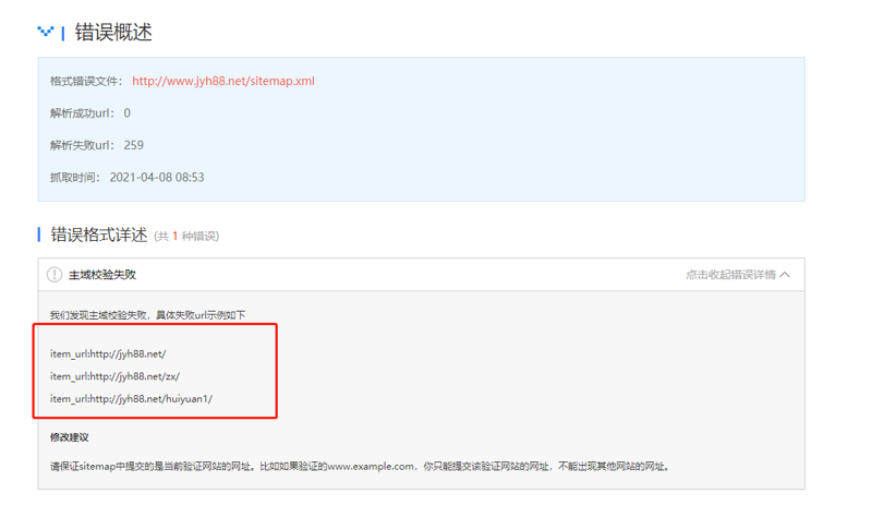 哪位老师给看一下,sitemap出现主域效验失败,但是我查看了地图,没发现他说的错误。