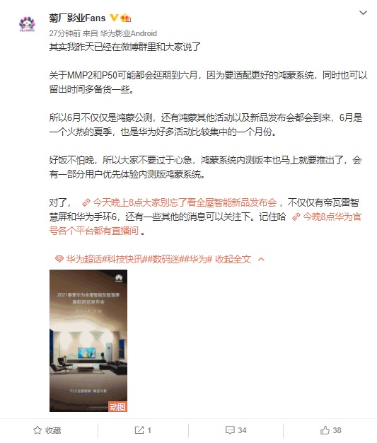 数码博主 @菊厂影业 Fans 透露,因为要适配更好的鸿蒙系统,同时也为了留出时间以增加备货量,华为 MatePad Pro 2 和 P50 或将延期到六月发布,所以 6 月除了鸿蒙外还有其他新品发布会到来,将会是华为多个活动集中的一个月份。