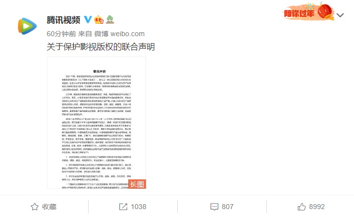 ,本次联合声明发起单位包括爱奇艺、腾讯视频、优酷、芒果 TV、咪咕视频等。