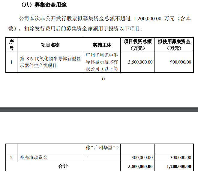 10 日消息 昨日晚间,TCL 科技发布公告称,拟定增募资不超 120 亿元,扣除发行费用后将用于“第 8.6 代氧化物半导体新型显示器件生产线项目”以及补充流动资金。