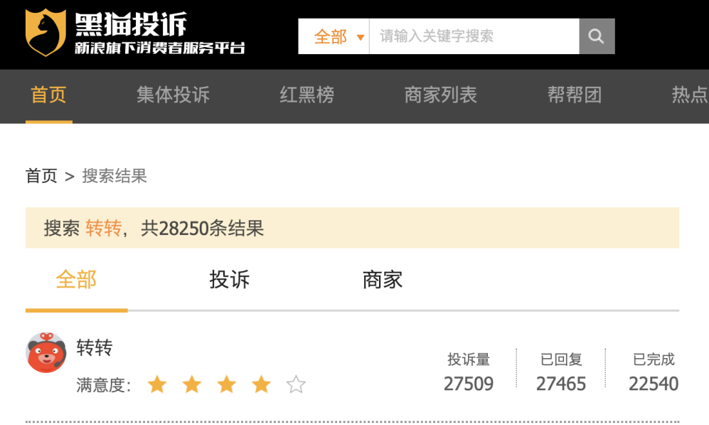 而在实际运作中,质检、质保等手段一旦控制不严格,仍会遭到大量的用户不满和投诉。从黑猫投诉的平台数据显示来看,关于转转的相关投诉也多达两万多条,来自于用户方面的投诉占到了绝大多数。