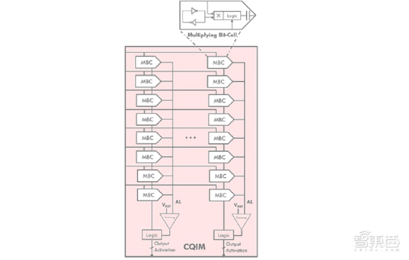 而在 Areanna 的 CQIM 架构中,模数、数模转换是通过与计算相同的电路结构执行的,该结构被称为乘法位单元(multiplying bit-cells,MBCs)。