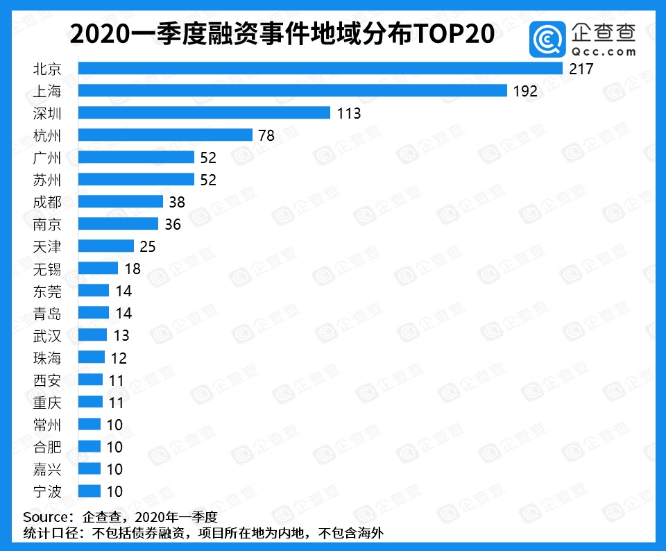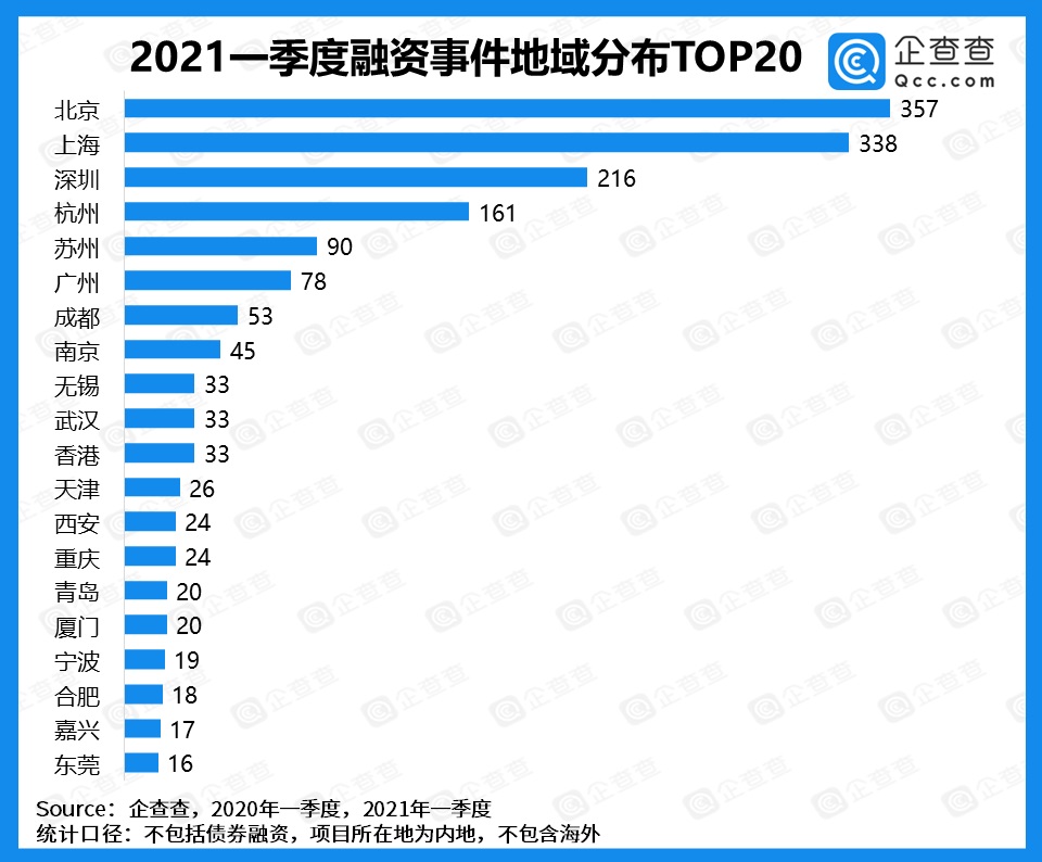 从地域分布来看,企查查数据显示,2021 年一季度北京、上海分别以 357 起和 338 起融资事件稳居第一梯队,深圳、杭州、苏州紧跟其后。值得一提的是,2020 年一季度,苏州与广州同样以 62 起融资事件并列第 5,而今年一季度苏州已超出广州 12 起融资事件,独占第 5 的位置。