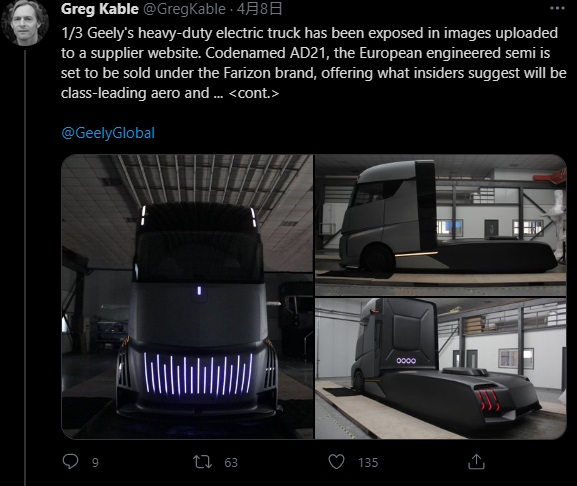 12 日消息 据外媒报道,一名叫格雷格 · 凯布尔 (Greg Cable)在 Twitter 上发布了吉利电动卡车的照片,透露吉利将以 Farizon 品牌推出新款重卡,该车型外观与特斯拉的半挂卡车 Semi 非常相似,甚至看起来比特斯拉 Semi 更酷。