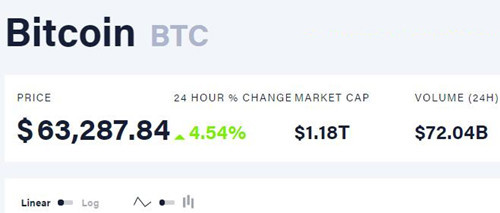 加密货币交易网站 coindesk 的数据显示,目前比特币的价格每枚 63287.84 美元,市值 1.18 万亿美元,近 24 个小时内的最高价为 63825.56 美元,这也是比特币目前的最高价格。