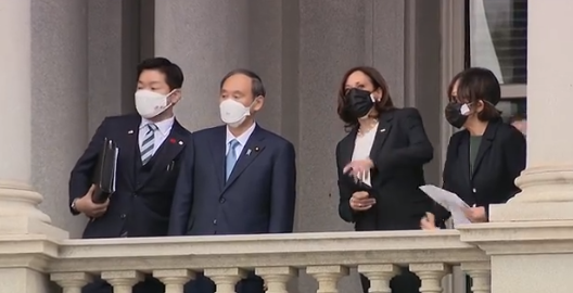 另据美联社报道,在美日双边会谈召开前,美国副总统哈里斯接见了菅义伟。图片显示,当时,哈里斯同样佩戴了黑白双层口罩,但菅义伟当时只戴了一个白色3M口罩。