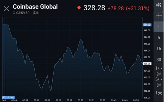 本周四,也就是 Coinbase 上市的第二天,该股开盘一度上冲 6.4%,但随后震荡下跌,全天报收于 322.75 美元,较前一交易日下跌 1.68%。