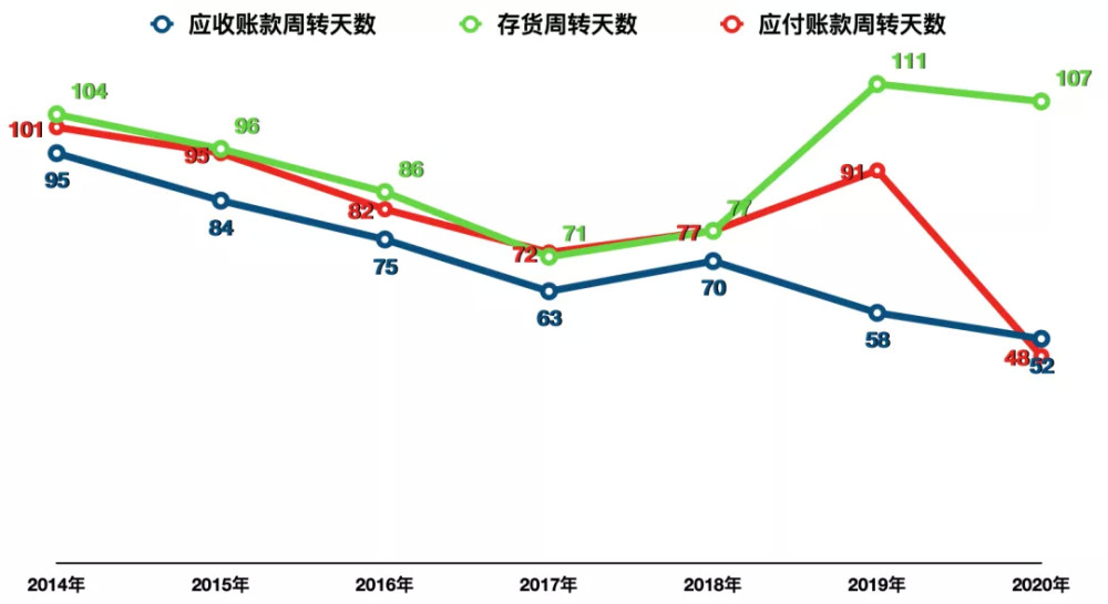 再看应付账款周转天数,从2019年的91天突然降至48天,这是有财报数据以来的最低点。一般来说,应付账款周转天数越长越好,公司就可以更多地占用供应商的钱来办自己的事儿。华为应付账款周转天数的暴跌,再次说明华为面对供应商没有比如以前强势了。