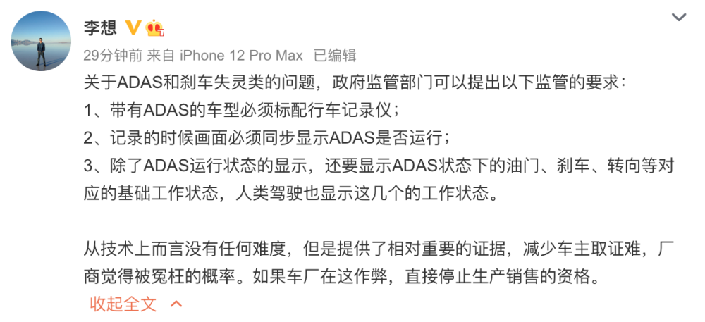 理想汽车CEO李想4月21日在微博发文,就ADAS和刹车失灵类的问题,向监管部门提出建议,包括: