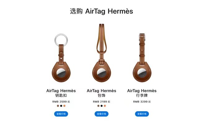 可能是考虑到用户日常要找的东西比较多,一般需要不止一个AirTag,苹果还推出了4个一套的套装版,价格为779元,比单独购买4个要便宜一百多元。而如果你是不差钱的用户,则有AirTag Hermès(爱马仕版本)可供挑选,其中钥匙扣2599元起,包饰2199元起,行李牌3299元起。