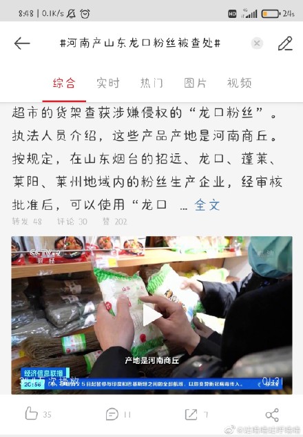 地理标志也是知识产权】近日,结合群众举报,成都市新都区市场监督管理局在一家超市的货架查获涉嫌侵权的“龙口粉丝”。执法人员介绍,这些产品产地是河南商丘。按规定,在山东烟台的招远、龙口、蓬莱、莱阳、莱州地域内的粉丝生产企业,经审核批准后,可以使用“龙口粉丝”作为商品名称,并对其实施原产地域保护。地理标志是一种重要的知识产权,如果冒用侵权,就可能对特色行业发展构成伤害。涉案厂家既没有取得授权委托,又不在龙口粉丝地理标志保护范围内,这种行为违反《中华人民共和国反不正当竞争法》第六条。