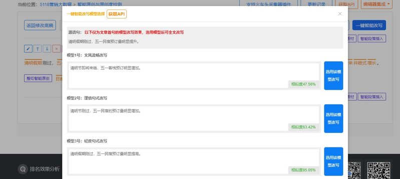 老铁网友回答:seo伪原创的工具可以用5118的,是我一直都在用的,伪原创的质量真的绝!一键改写生成三种模板,根据原创度选择,编辑完成后还会有不用颜色提示原创度,最后再用原创度检测工具检测原创度,完美!