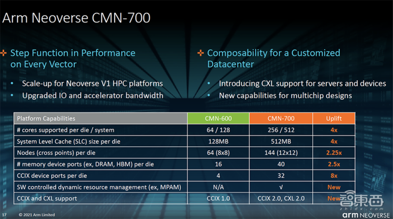 同时,Arm 也发布了构建基于 Neoverse V1 和 N2 平台高性能 SoC 的关键部件 ——CMN-700。