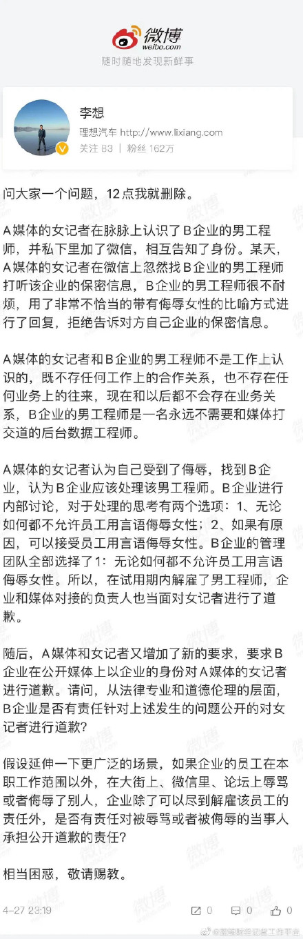 李想向网友发问,从法律专业和道德伦理的层面企业是否有责任针对上述发生的问题公开的对女记者进行道歉?企业是否有责任对被辱骂或者被侮辱的当事人承担公开道歉的责任。