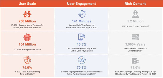 用户方面,招股书显示喜马拉雅移动端月活用户 1.04 亿,IoT 及其他第三方开放平台月活用户 1.46 亿,总月活用户量达 2.5 亿。今年第一季度,喜马拉雅平均 MAU(月活跃用户数量)为 2.503 亿,而上年同期为 2.017 亿。