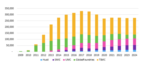 各晶圆厂 28nm 及以下的量产能力,图片源自 OMDIA