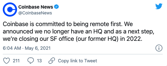 Coinbase 周三在 Twitter 上称:“Coinbase 致力于远程办公优先政策。我们宣布不再拥有总部。下一步,我们将在 2022 年关闭旧金山办公室 (我们的前总部)。”