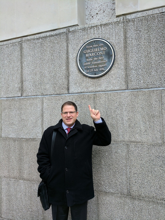 安蒙在纪念“无线电之父”古利莫?马可尼 1896 年首次公开传输无线信号的地点留影