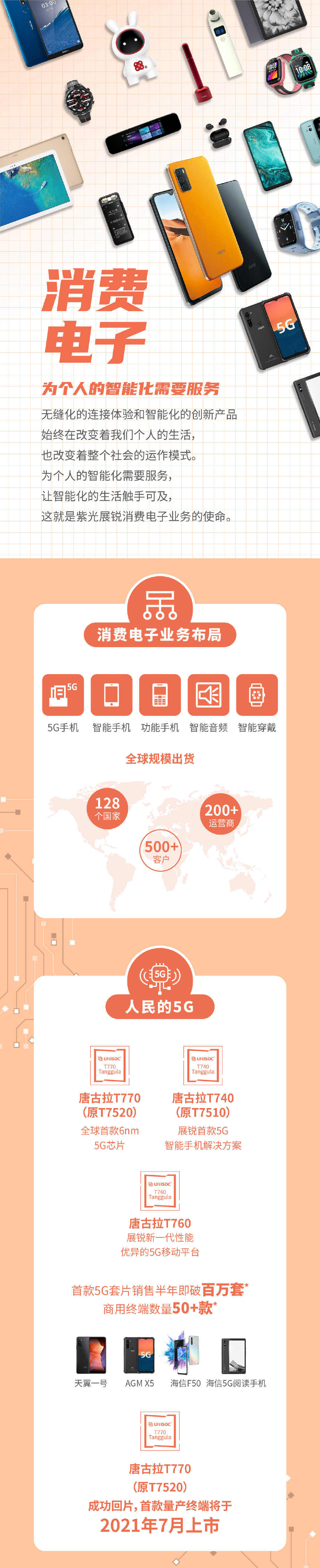 8 日消息 紫光展锐昨日发布了 2020 年业绩报告。该公司生产的 4G、5G 移动芯片在去年均获得了较大幅度增长,其中首款 5G 套片销售半年即破百万套,商用终端数量超过 50 款,包含天翼一号、AGM X5、海信 F50 等手机。官方还表示,唐古拉 T770 5G 芯片近日成功回片,首款量产终端将于 2021 年 7 月上市。
