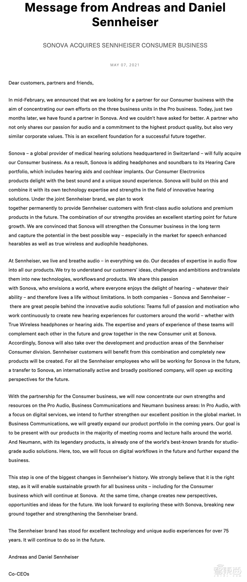 ▲森海塞尔出售消费者业务部门公开声明