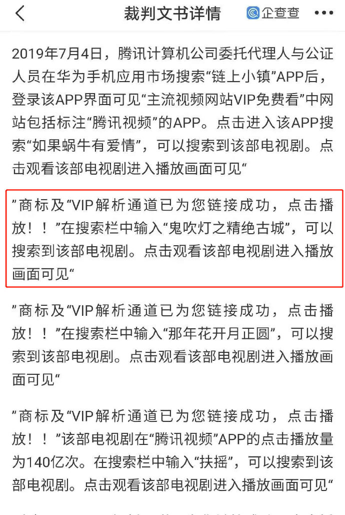 8 日消息 企查查 App 显示,近日,隆耀(天津)电子商务有限公司因在其“链上小镇”App 上使用“腾讯视频”相关商标被法院认定侵权,同时法院查明该平台还存在盗播腾讯视频电视剧行为。企查查显示,法院一审判决该公司停止侵害腾讯享有的“腾讯视频”相关商标及停止不正当竞争行为,赔偿腾讯 5000 万元人民币。