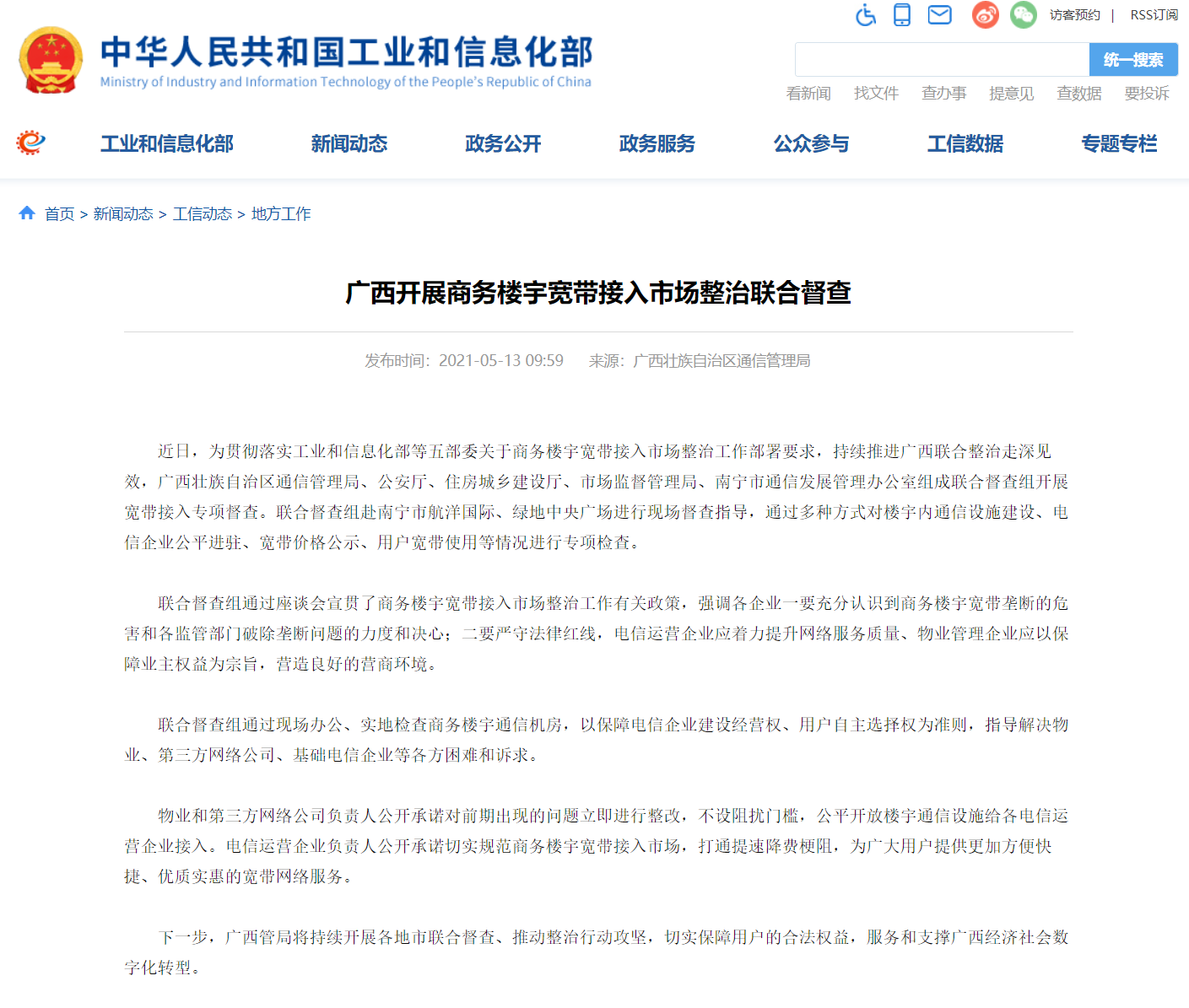 具体来看,广西联合督查组对楼宇内通信设施建设、电信企业公平进驻、宽带价格公示、用户宽带使用等情况进行专项检查。联合督查组强调,各企业一要充分认识到商务楼宇宽带垄断的危害,和各监管部门破除垄断问题的力度和决心;二要严守法律红线,电信运营企业应着力提升网络服务质量、物业管理企业应以保障业主权益为宗旨,营造良好的营商环境。