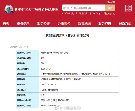据北京文旅局网站近日披露的罚单显示,优酷信息技术(北京)有限公司被罚1万元。处罚事由为经营性互联网文化单位提供含有危害国家统一、主权和领土完整的互联网文化产品。 ?