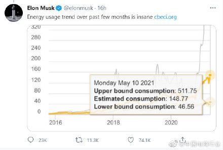 周四,特斯拉CEO马斯克谴责比特币生产所用的能源“疯狂”,并表示出于对环境的考虑,他突然拒绝使用这种加密货币作为支付手段。他在社交媒体发布了一张比特币能耗图,并表示:“过去几个月的能源使用趋势是疯狂的。特斯拉暂停用比特币来支付购车费用,导致数字货币纷纷下跌。两个多小时的时间内,整个加密货币市场的市值损失了约3658.5亿美元。
