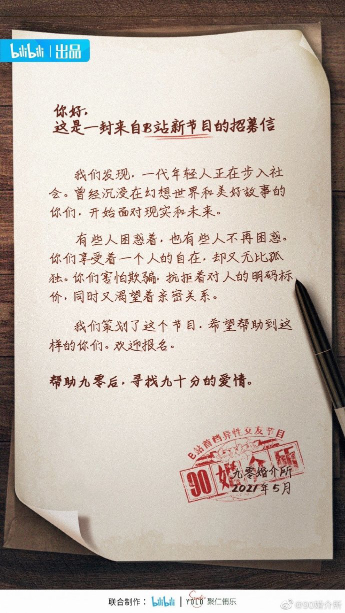 B 站《90 婚介所》节目瞄准 90 后,要寻找“九十分的爱情”。节目还发布了一封招募信,比起形式更重于态度的表达,和传统相亲交友节目画风有所不同。聚焦在年轻人的视角,诚挚帮助单身男女。