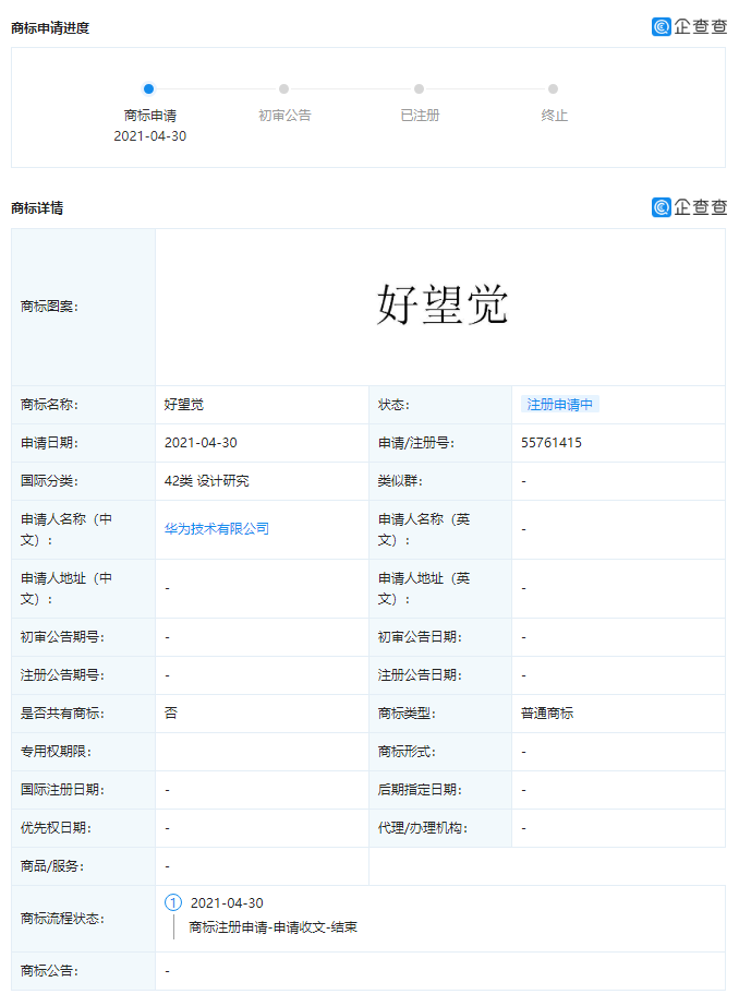 14 日消息 企查查 App 显示,近日,华为技术有限公司新增多项“好望觉”商标申请信息,国际分类涉及设计研究、广告销售、科学仪器,目前商标状态均为“注册申请中”。