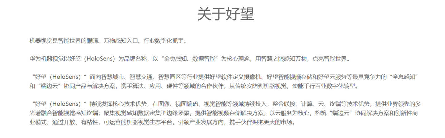,“好望”是华为机器视觉推出的 HoloSens 中文品牌,面向交通、园区、教育等行业提供软件定义摄像机(HoloSens SDC)、智能视频存储(HoloSens IVS)和华为好望云服务(HoloSens Cloud Service)。