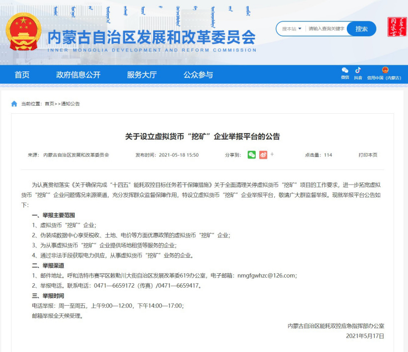 19 日消息 根据内蒙古自治区发展和改革委员会消息,为认真贯彻落实《关于确保完成“十四五”能耗双控目标任务若干保障措施》关于全面清理关停虚拟货币“挖矿”项目的工作要求,进一步拓宽虚拟货币“挖矿”企业问题情况来源渠道,充分发挥群众监督保障作用,特设立虚拟货币“挖矿”企业举报平台,敬请广大群监督举报。
