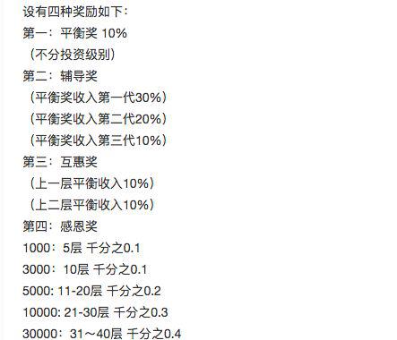 根据瑞士联邦储备委员会成员在网上公布的销售信息,每个人都可以在网下发展,所以他们可以获得佣金。具体收入水平可分为四类:平衡奖(10%)、咨询奖(第三代60%)、互惠奖(第二代20%)和感恩奖(5至40层从0.1%至0.4%不等)。